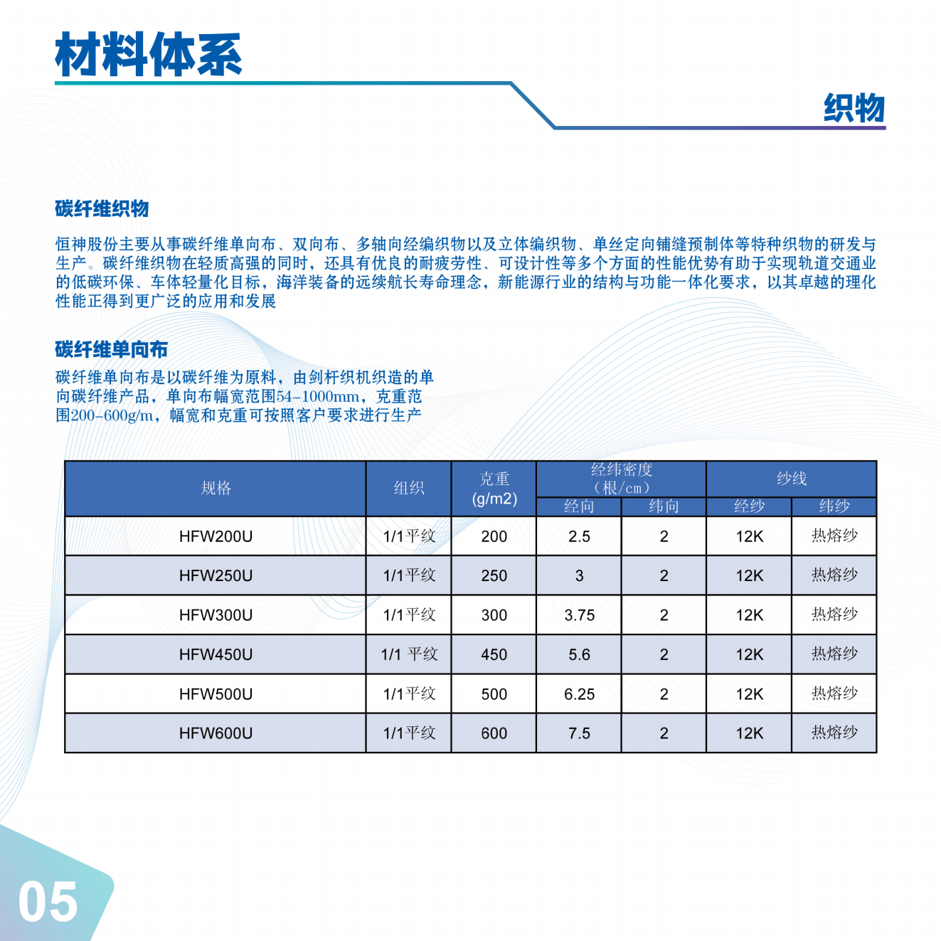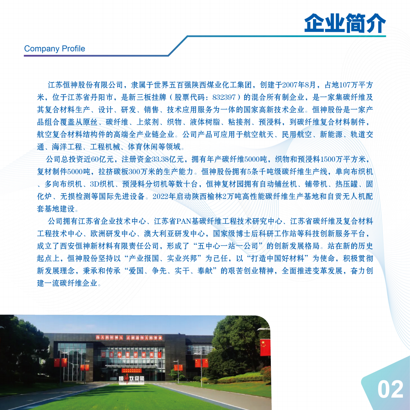 江蘇恒神股份有限公司,創建於(yú)2007年8月,占地954畝,位於(yú)江蘇省丹陽市,新三闆挂牌(股票代碼:832397),是一家集碳纖維及其複合材料生産(chǎn)、設計、研發、銷售、技術應用服務爲一體的國家高新技術企業,隸屬於(yú)世界五百強陝西煤業化工集團。産(chǎn)品組合覆蓋從原絲、碳纖維、上漿劑、織物、液體樹脂、粘接劑、預浸料,碳纖維複合材料制件,航空複合材料結構件的高端全産(chǎn)業鏈企業。公司産(chǎn)品可應用於(yú)航空航天、民用航空、新能源、軌道交通、海洋工程、工程機械、體育休閑等領域。産(chǎn)品型号包括高強碳纖維如:HF20系列(T300級)、HF30系列(T700級)、HF40系列(T800級)、HF50系列(T1000級)及高強高模HM系列。産(chǎn)品規格包括:1K、3K、6K、12K、24K和50K 等。